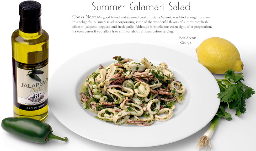 2 - Strain the calamari and place in a mixing bowl. Add all of the remaining ingredients and mix well. Add salt and pepper (to taste) and serve chilled.